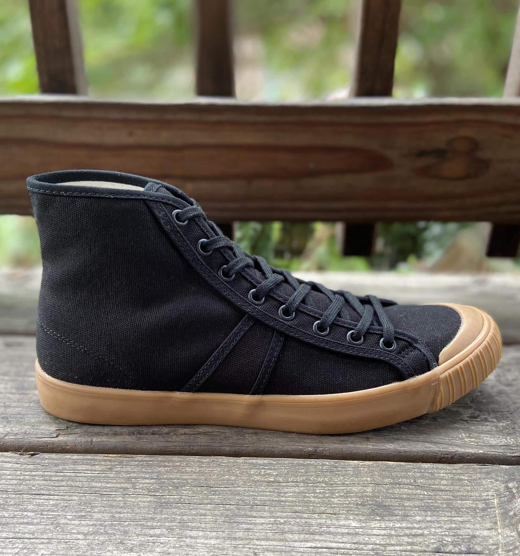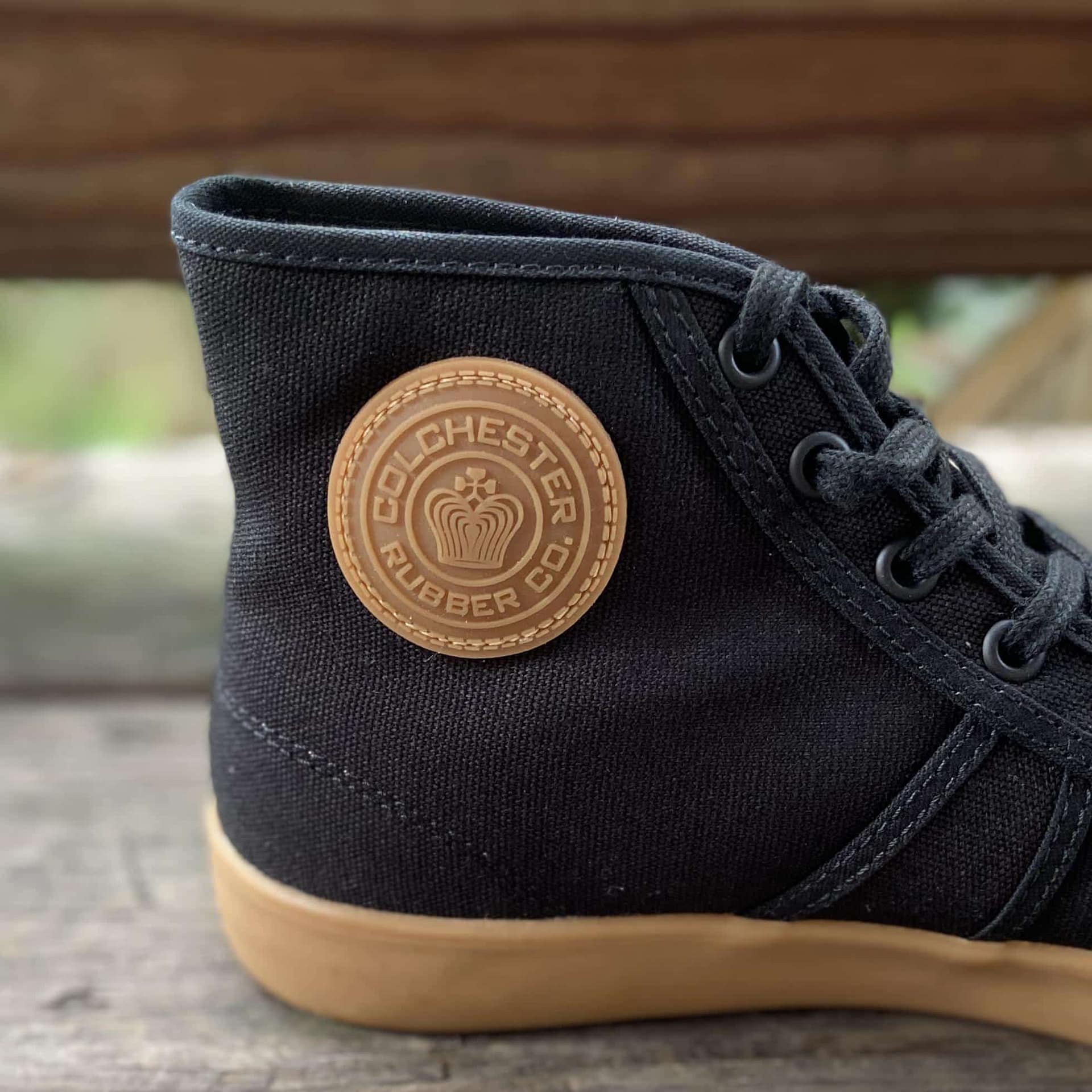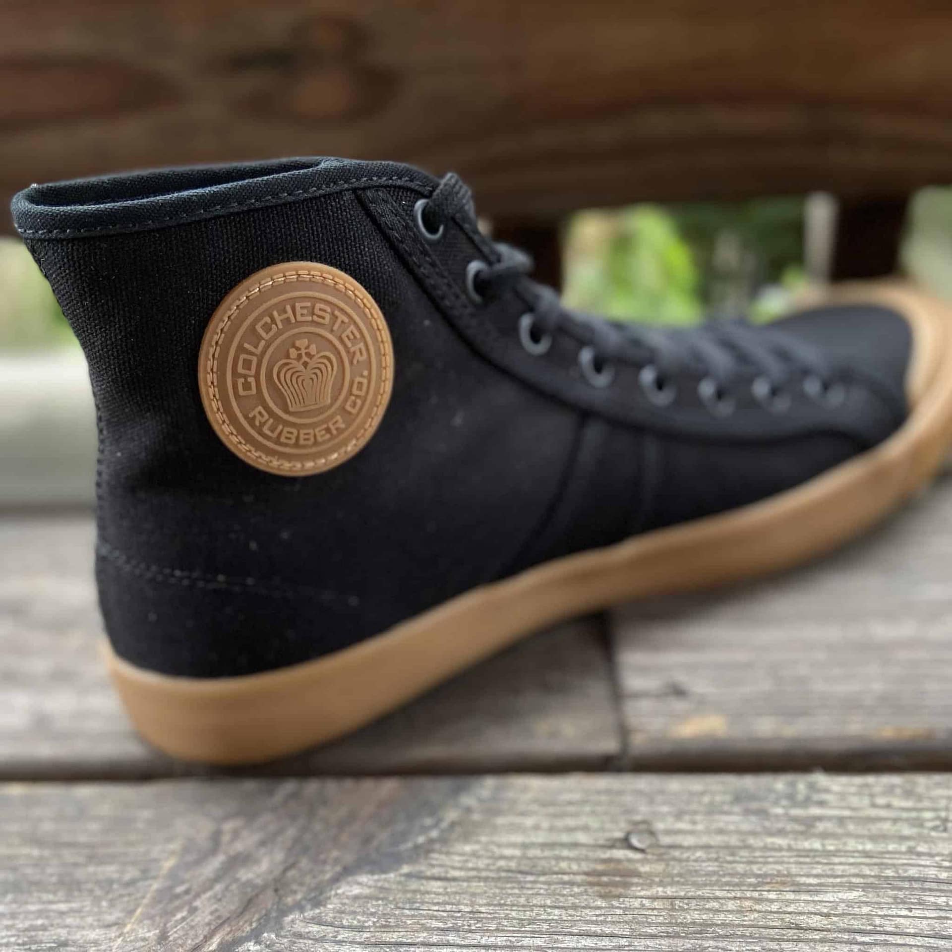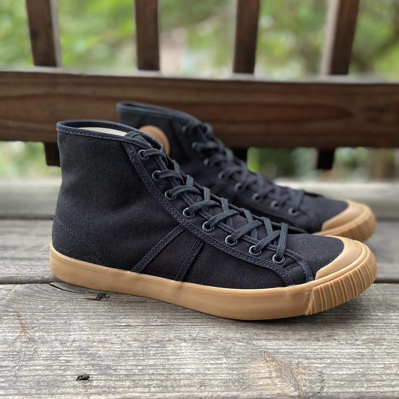 National Treasure Black Gum high top sneakers are replicas of the original basketball shoe invented in 1892 by the original Colchester Rubber Co. In 2004, a vintage pair was found at an estate sale in Vista, CA. The 5″ high-top design, canvas uppers, turkey feather sole pattern, in addition to the Colchester Rubber Co. crest, are all revived on these updated classics.