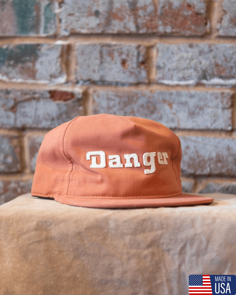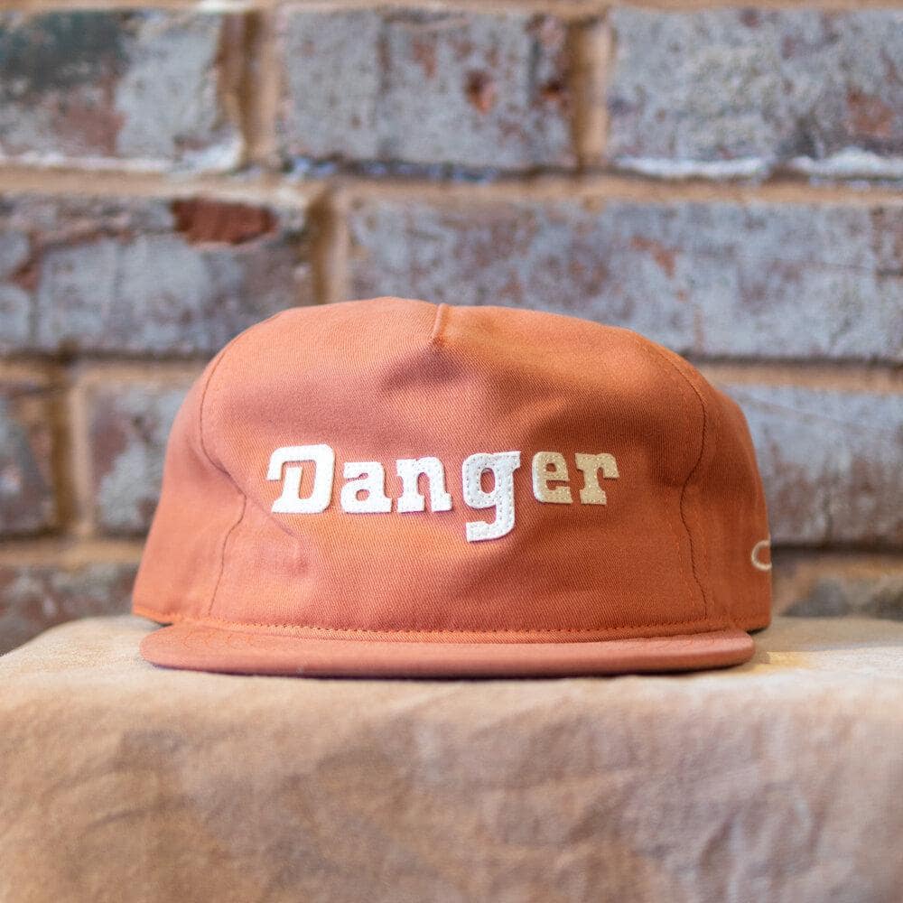 Danger Snapback Hat from The Ampal Creative features a crushable burnt orange upper made from a 100% cotton brushed twill. Applique lettering adorns the front panels, while the underside reveals a vintage blanket stripe lining.