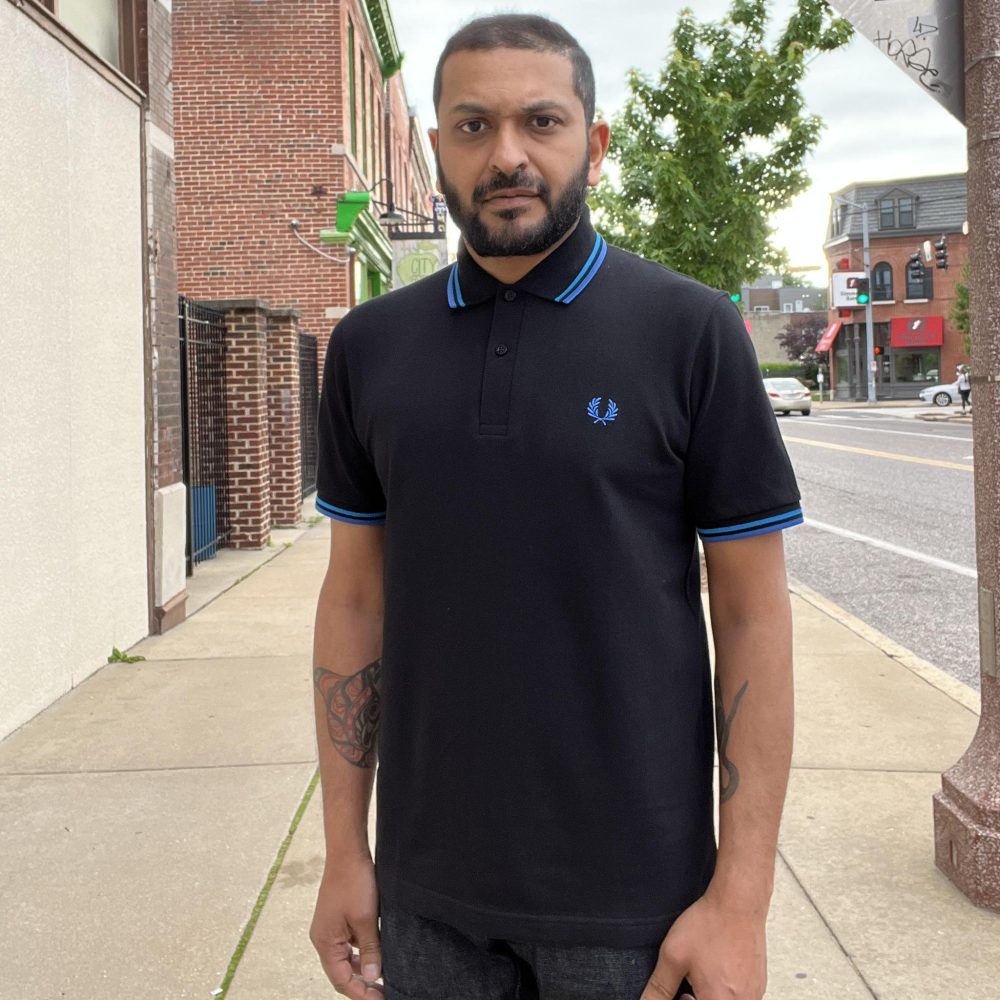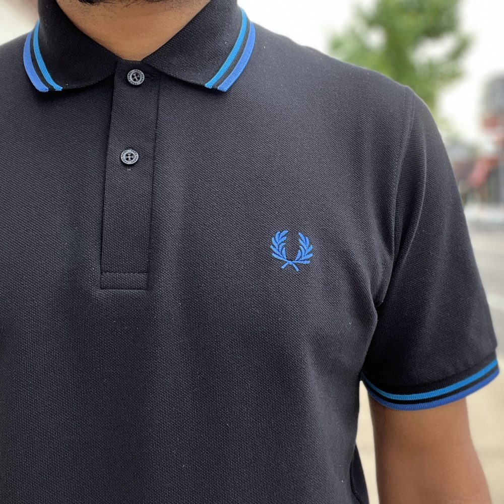 M12 Polo Manchester Blue by Fred Perry is made in Leicester, England and its iconic styling hasn’t changed since it was originally designed by Fred Perry himself in the 1950s. This version features a black colorway with two shades of blue tipping on the collar and sleeves.