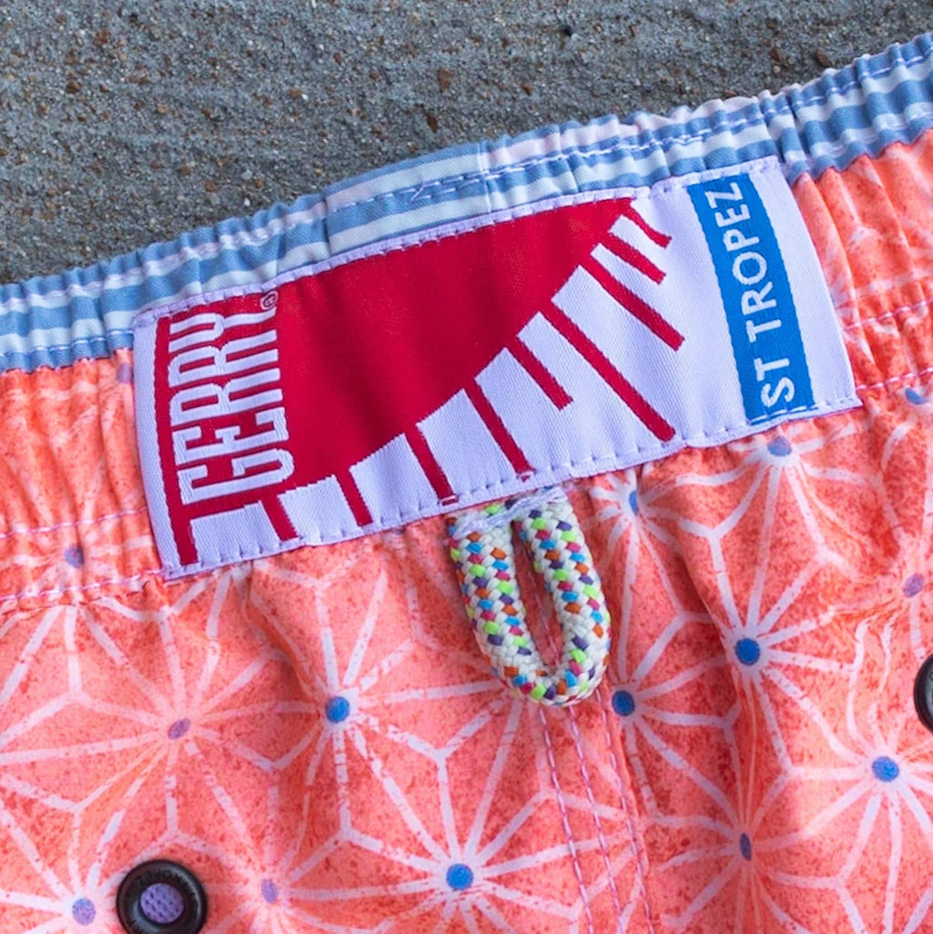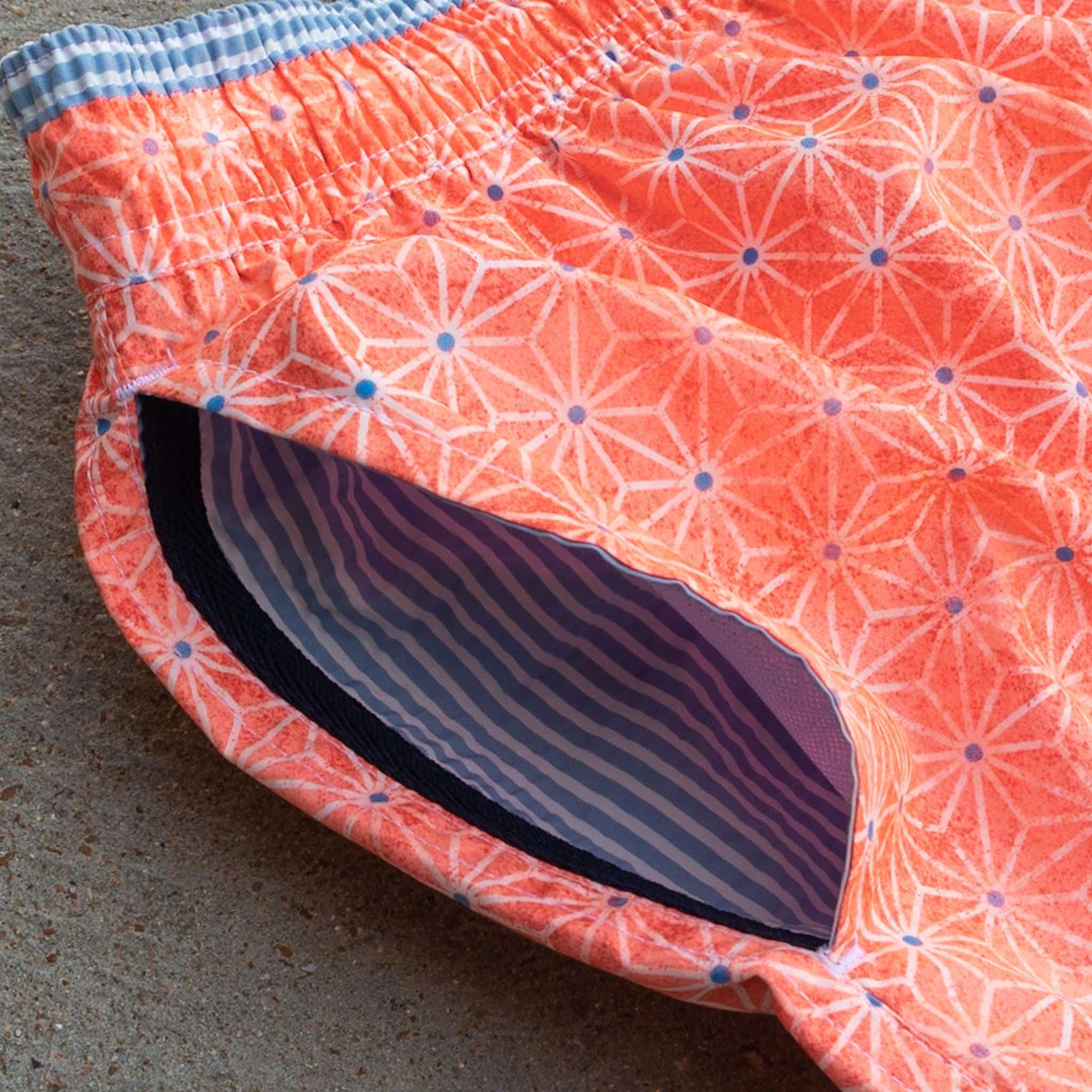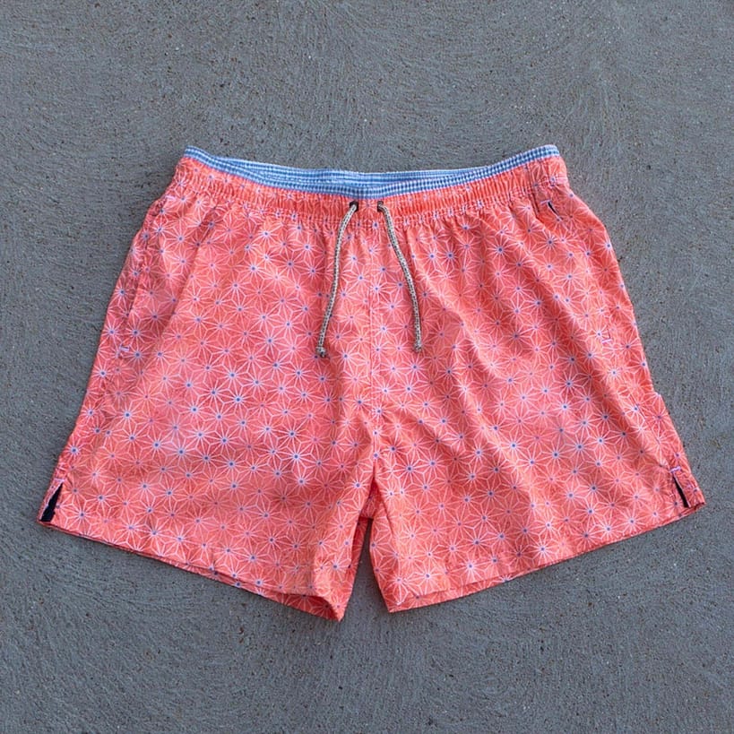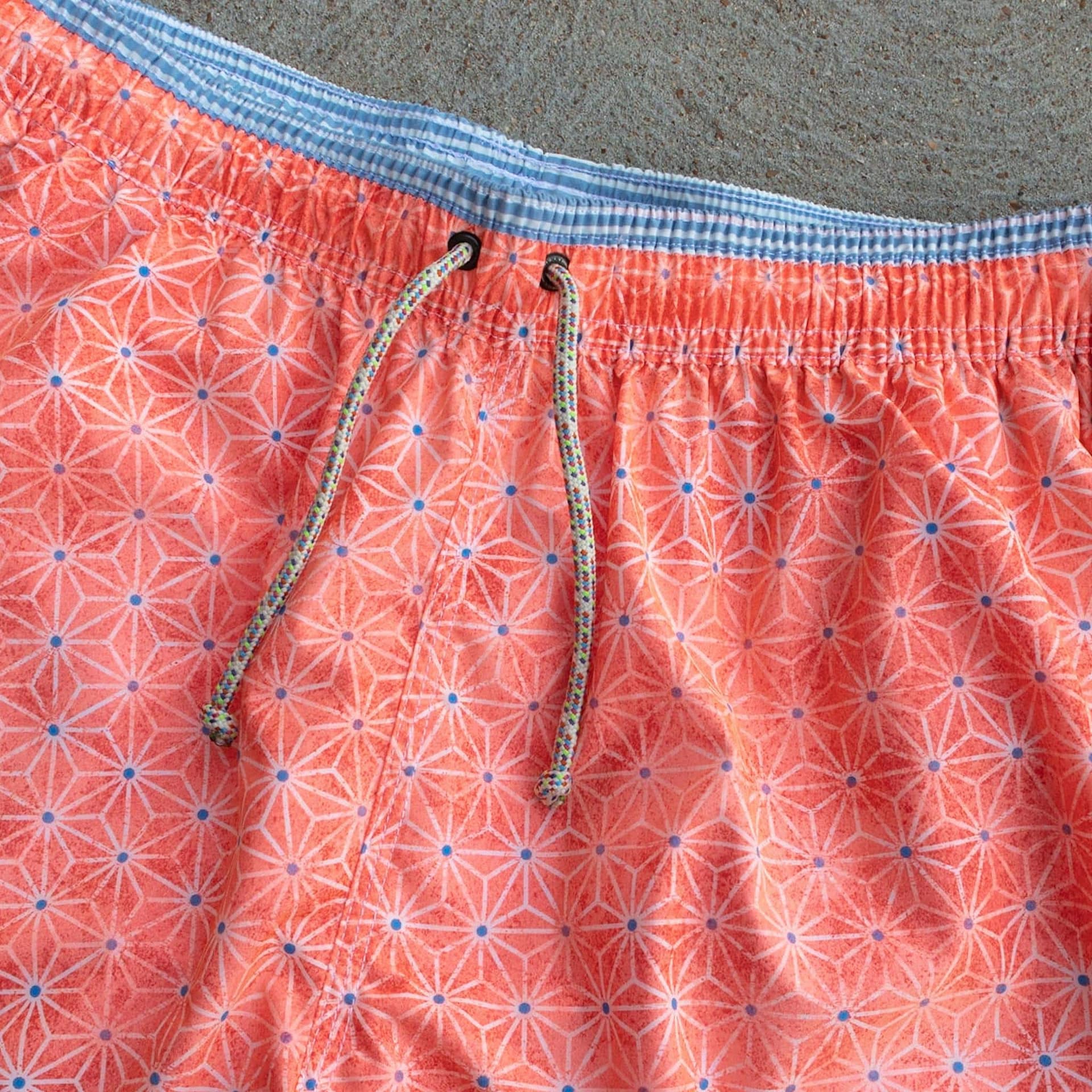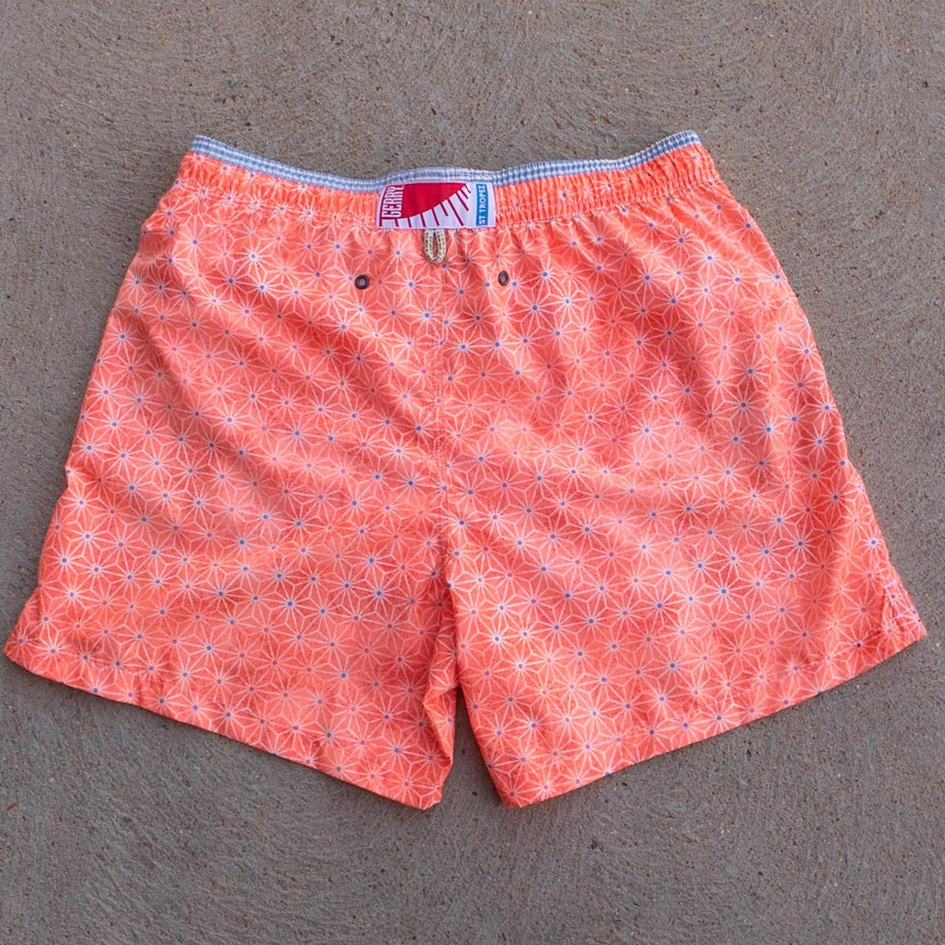 Mallorca Geometric Swim Trunks from Gerry St. Tropez add a little zip to your beach attire this summer. Made in Spain from a specially made polyamide fabric that is soft to the touch. Featuring a geometric star pattern on an orange background, side pockets, side slits, drainage eyelets, and a comfortable mesh lining.
