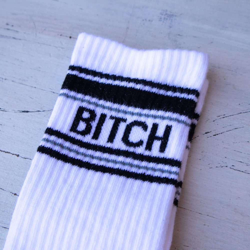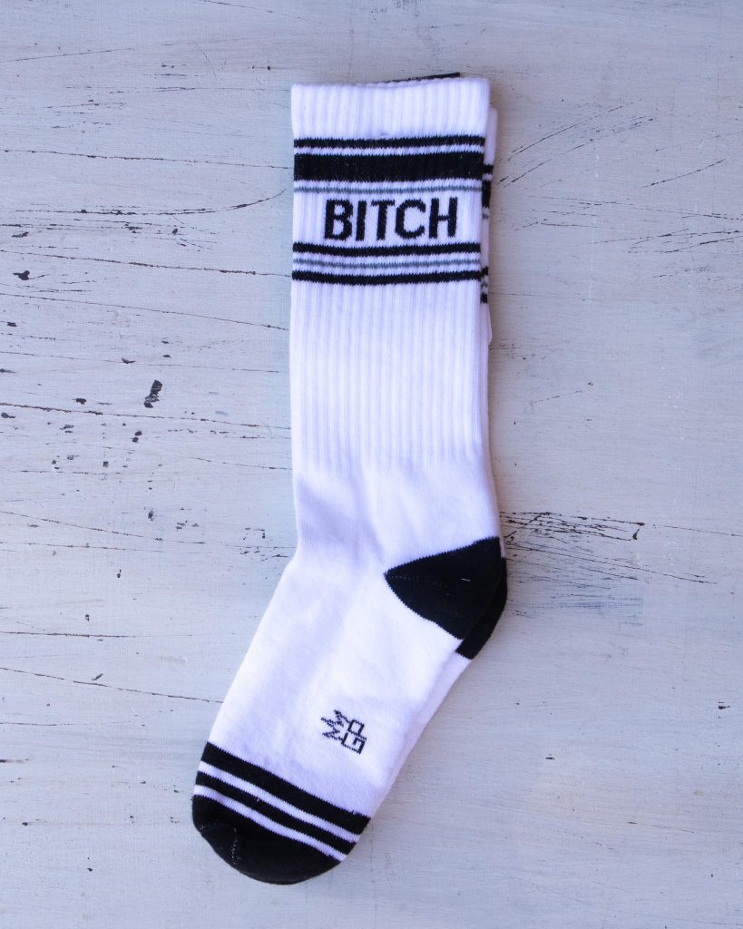 Gumball Poodle Bitch Socks are made in the USA from cotton/poly/spandex/rubber blend. A wide-ribbed gym sock style that reaches to the mid-calf on most folks. The size range fits a women’s size 6 US to men’s size 15. As a thicker weave, these socks are best worn with sneakers and other roomy shoe styles.