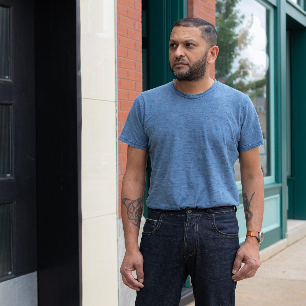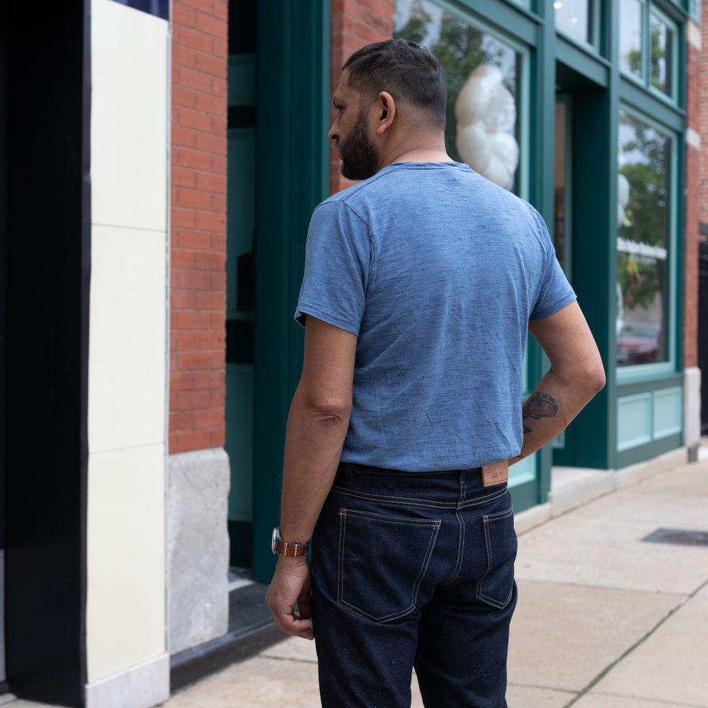 Whether you’re layering under a jacket or wearing it solo, the Light Indigo Slub Tee delivers timeless style with a touch of individuality. It’s not just a t-shirt—it’s a lived-in essential with a story to tell. The model is 5’8″, 155 lbs, and is wearing a size small.