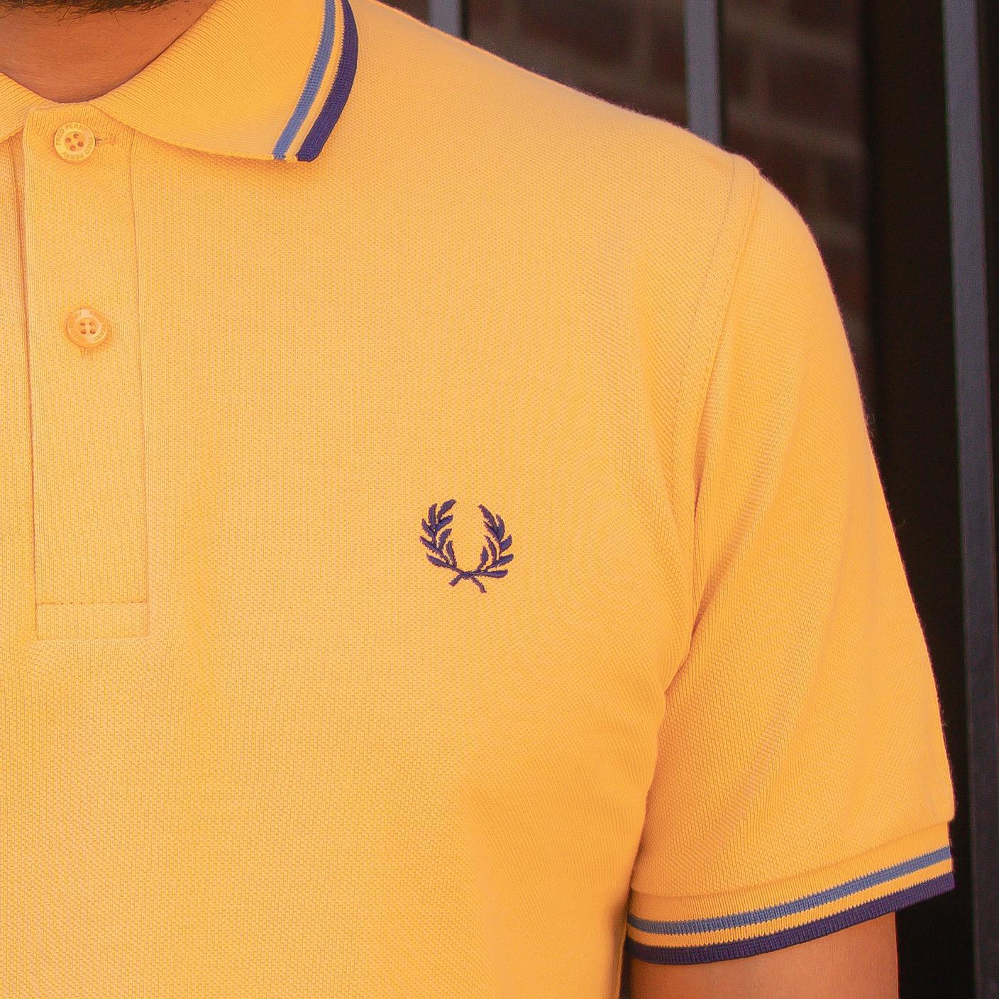 M12 Polo Golden Hour by Fred Perry is made in Leicester, England and its iconic styling hasn’t changed since it was originally designed by Fred Perry himself in the 1950s. This version features a yellow colorway with French navy and midnight blue accented on the collar and sleeves.