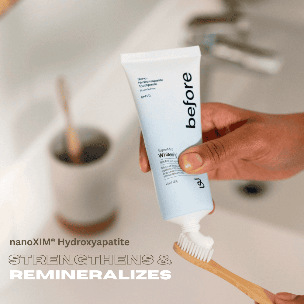 Brighten your smile the healthy way with the n-HA Whitening Toothpaste by Before, a premium formula powered by nano-hydroxyapatite (n-HA). Unlike harsh whitening products that can damage enamel, this innovative toothpaste strengthens and restores teeth while gently removing stains for a naturally radiant smile.