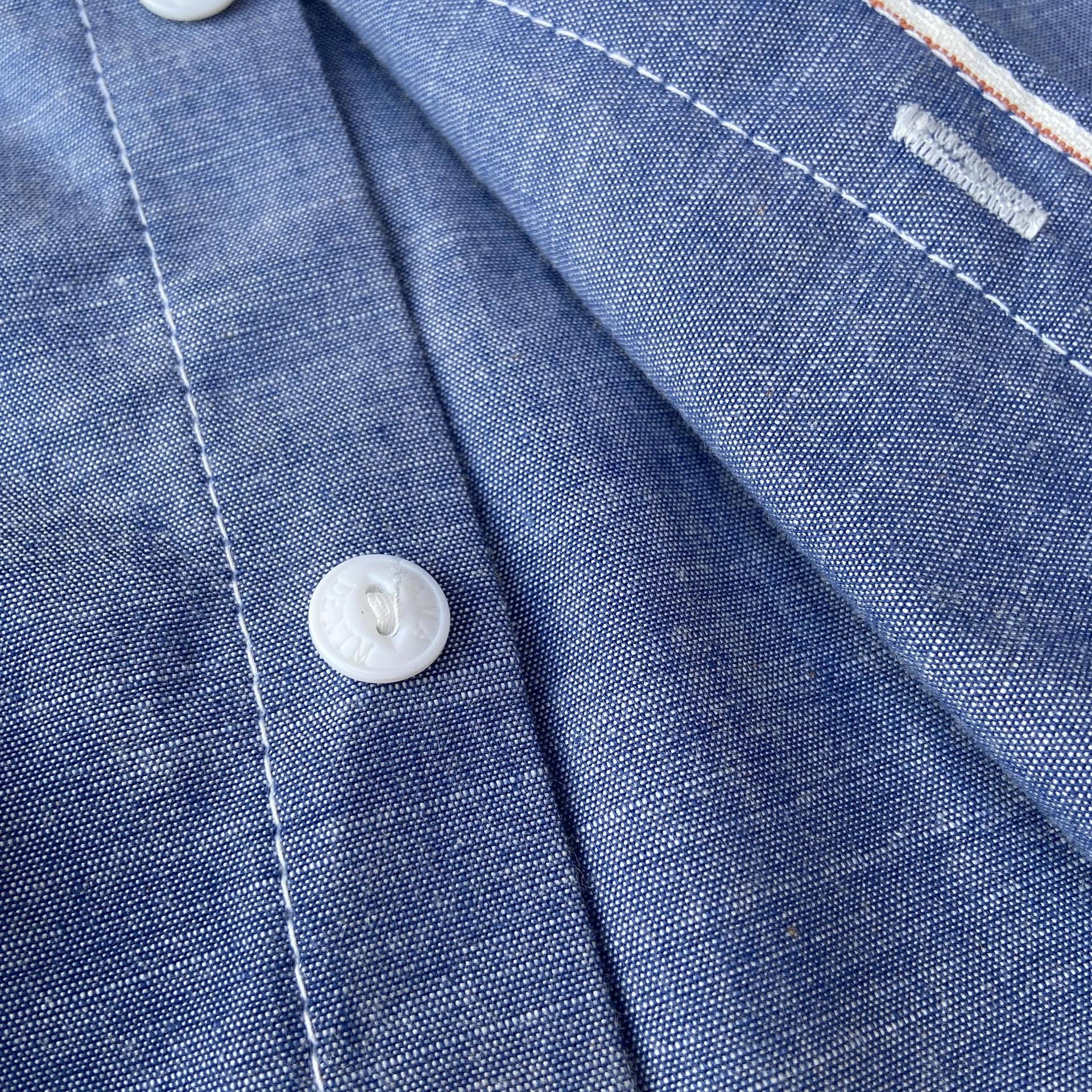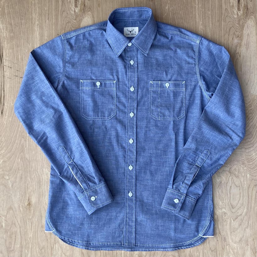 Light Chambray Work Shirt by Nama Denim is crafted from a summer-friendly 5 oz. Japanese selvedge chambray fabric. This indigo work shirt features two chest pockets, triple-needle chain stitch construction throughout, and cat-eye buttons. You’ll find an abundance of hidden selvedge details across the inner placket, sleeve placket, and cuffs.