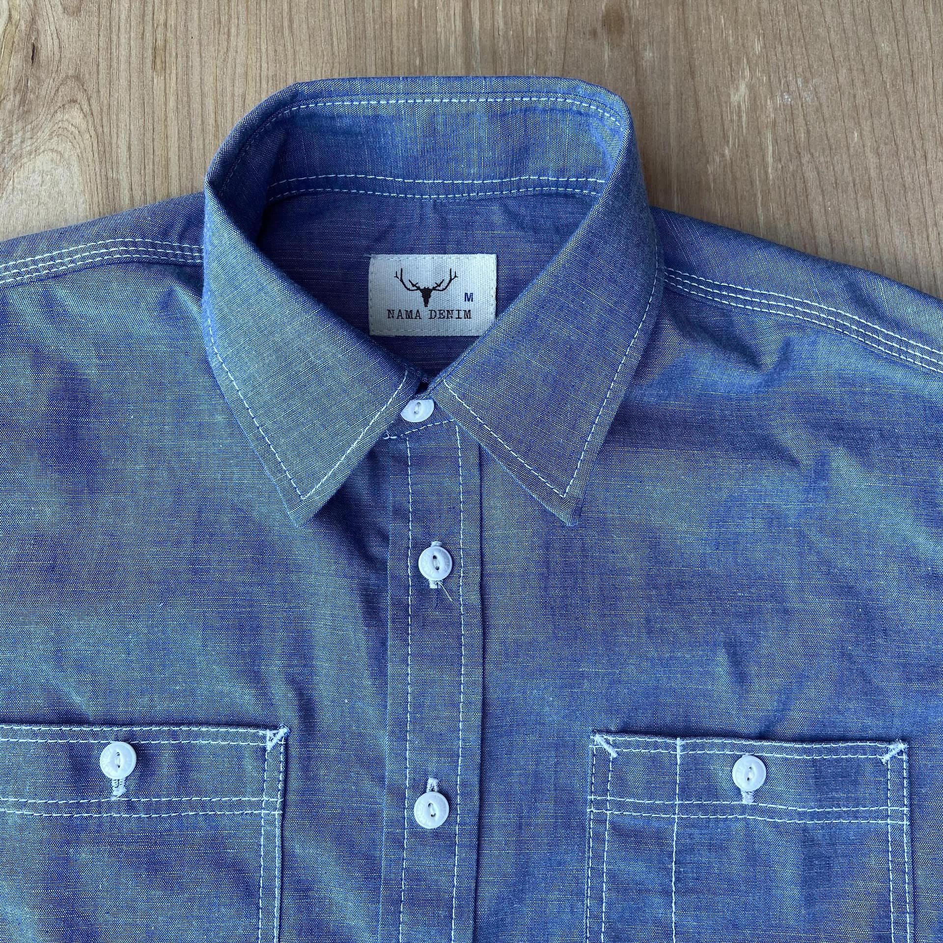 Super lightweight and comfy from the get-go, the light chambray work shirt looks fantastic with a pair of chinos. When looking closely at the fabric, you’ll notice that it is highly textured with slub characteristics throughout. Made in-house at the Nama Denim workshop.