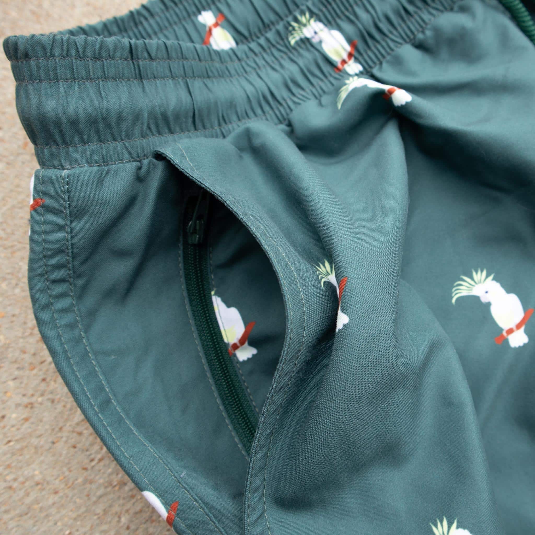 Narwal Cockatoo Swim Trunks are sustainably made from 100% recycled polyester derived from plastic waste. Whether you’re at the beach, pool, or on the streets, these multi-purpose shorts will keep you feeling and looking cool. Featured in an army green color with subtle Cockatoos printed all over.
