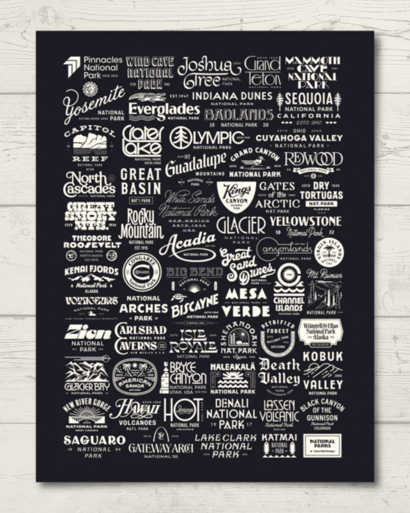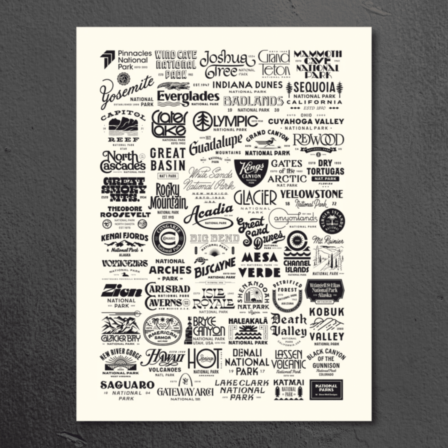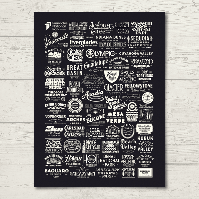 National Parks Type Poster by The Landmark Project showcases the diversity of our National Parks in this original typgraphic poster. Designed by Steve Wolf, a branding and illustration specialist, who arranged all 63 parks with unique typeface treatments that interlocks into one compelling graphic.