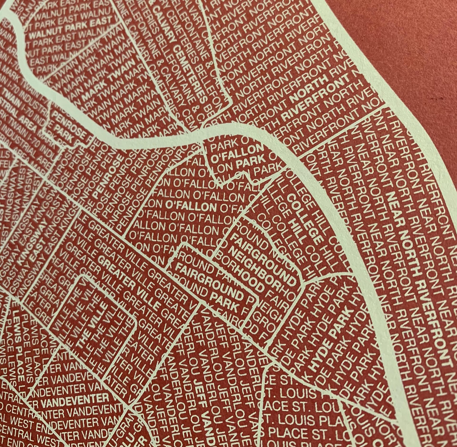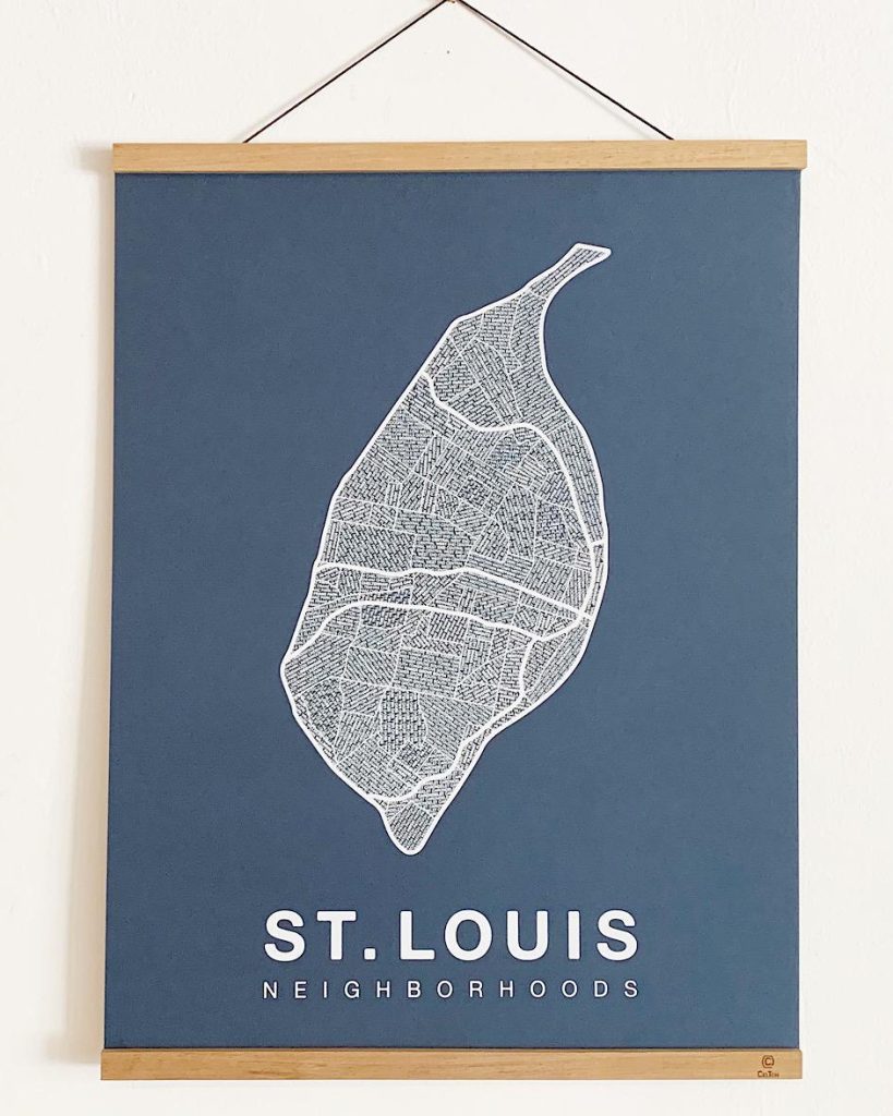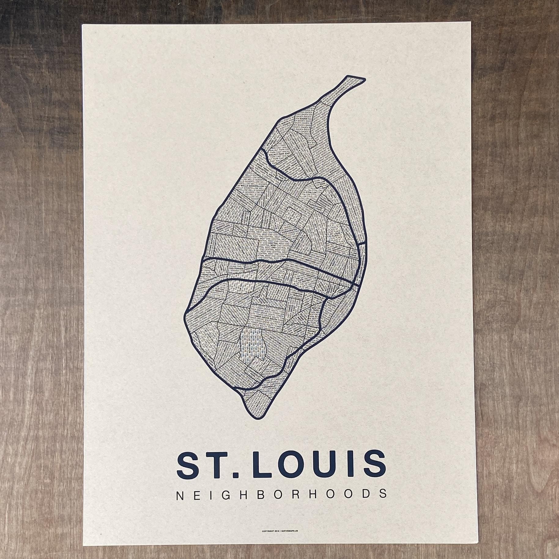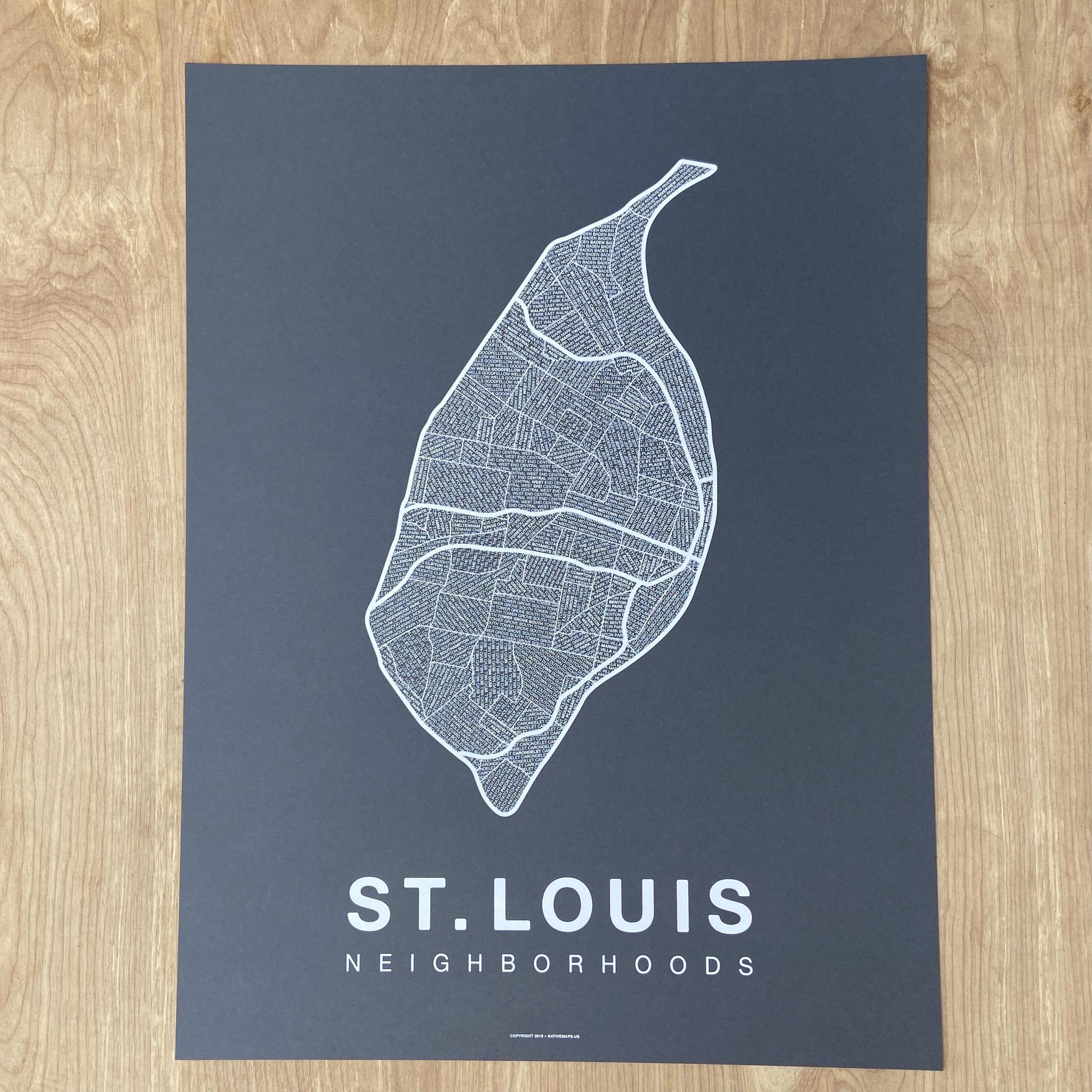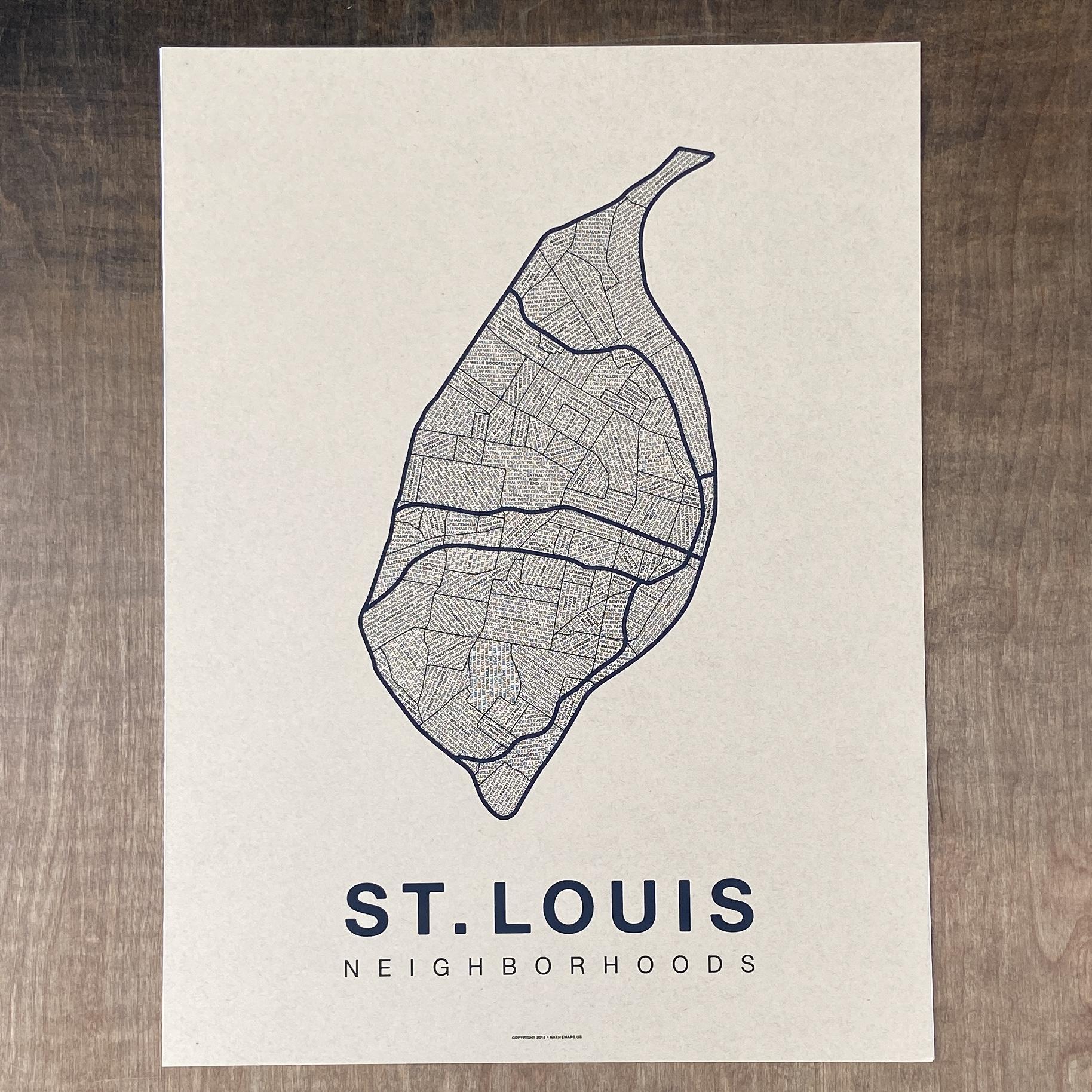 St. Louis Neighborhood Map is examined by local experts and highlights every neighborhood within the city limits in a minimalist style. The 18″ wide by 24″ height is perfect for framing. Maps are screen-printed by hand on heavyweight paper with a matte on matte texture.
