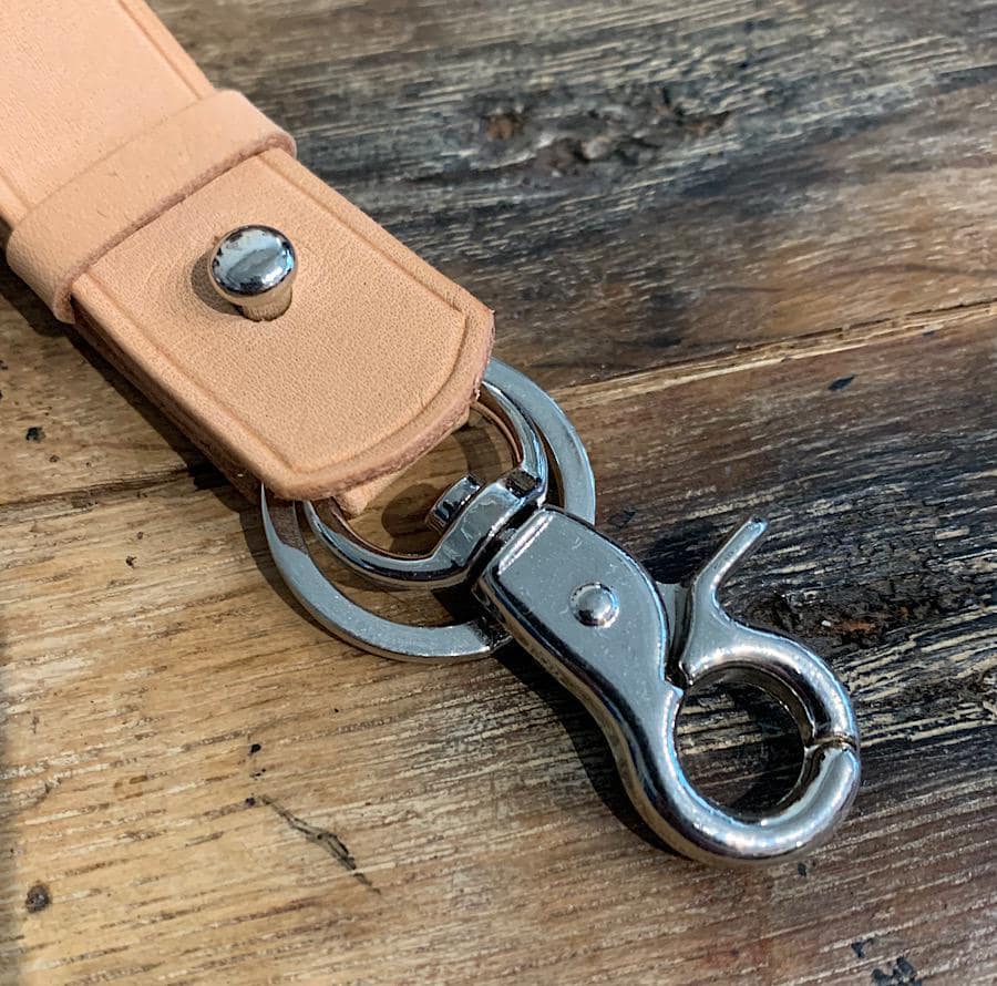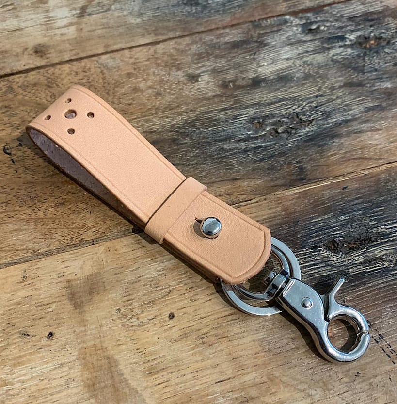 Natural Leather Key Fob is handmade with natural Hermann Oak vegetable-tanned leather. Features a nickel swivel trigger snap and matching split key ring to hold many keys. Customizable to use one or the other by unscrewing the stud closure.