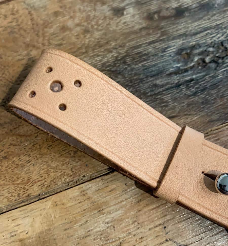 Over time, the natural leather will garner a patina and turn a beautiful dark brown. Made in-house at our workshop in St. Louis, MO.