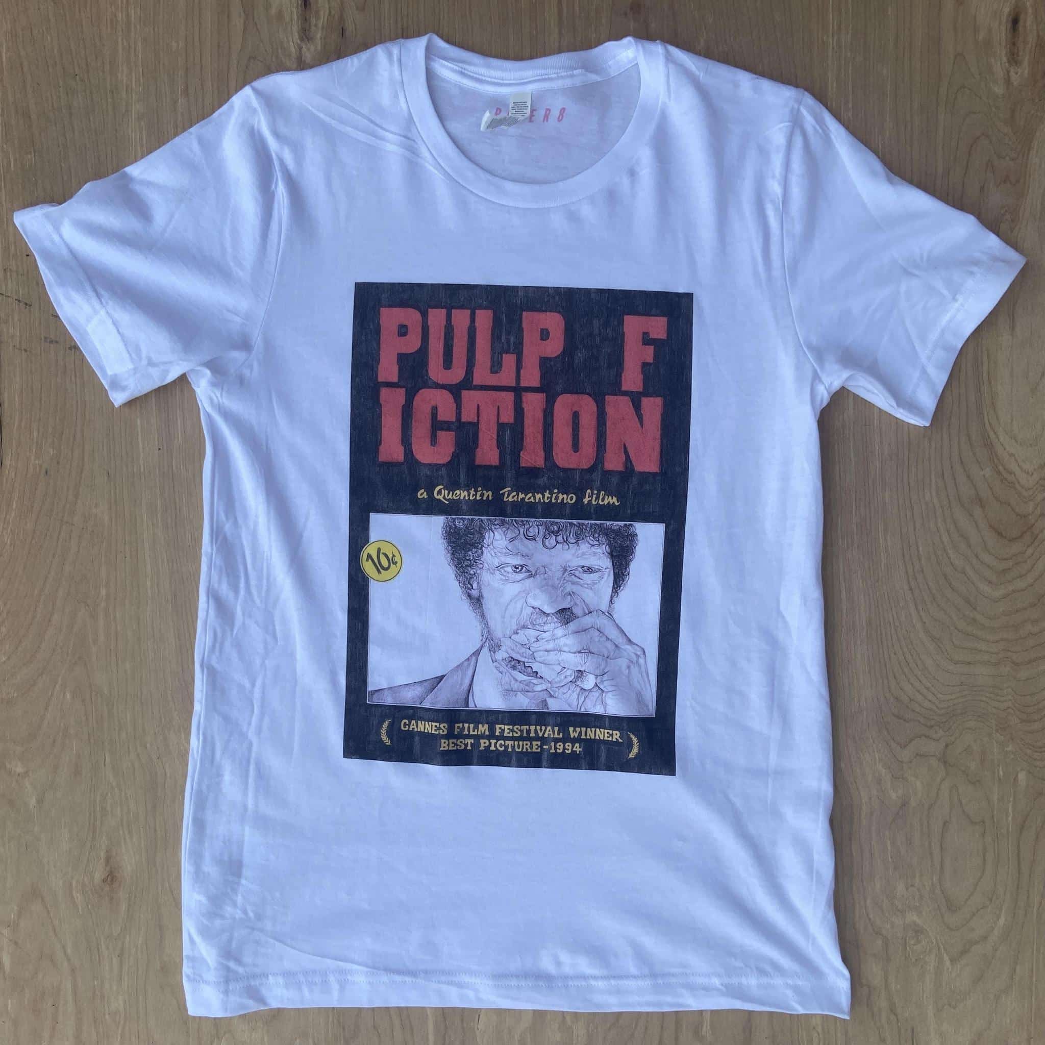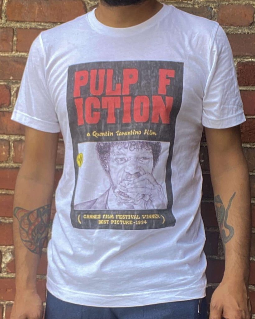 Pulp Fiction Poster Tee by Paper 8 Apparel. Features an illustration of Samuel L Jackson’s character, Jules eating a “Royale with Cheese” from the Quentin Tarantino, film Pulp Fiction in pencil. Drawn by Los Angeles artist Matthew Warren.