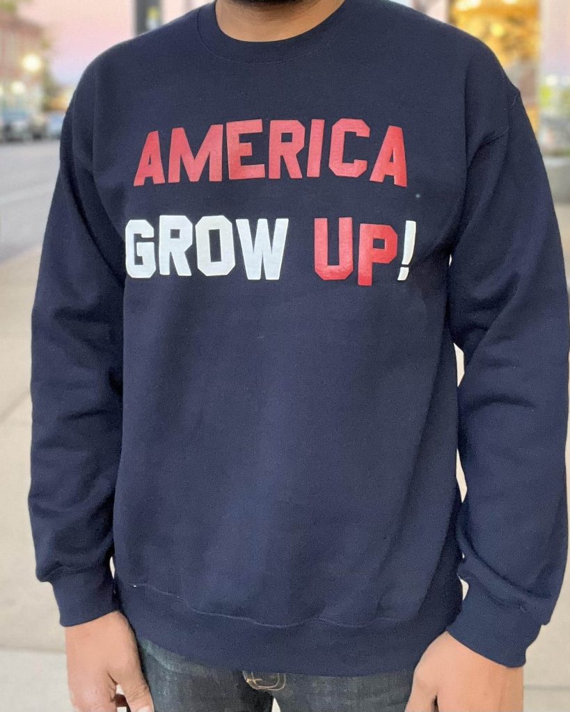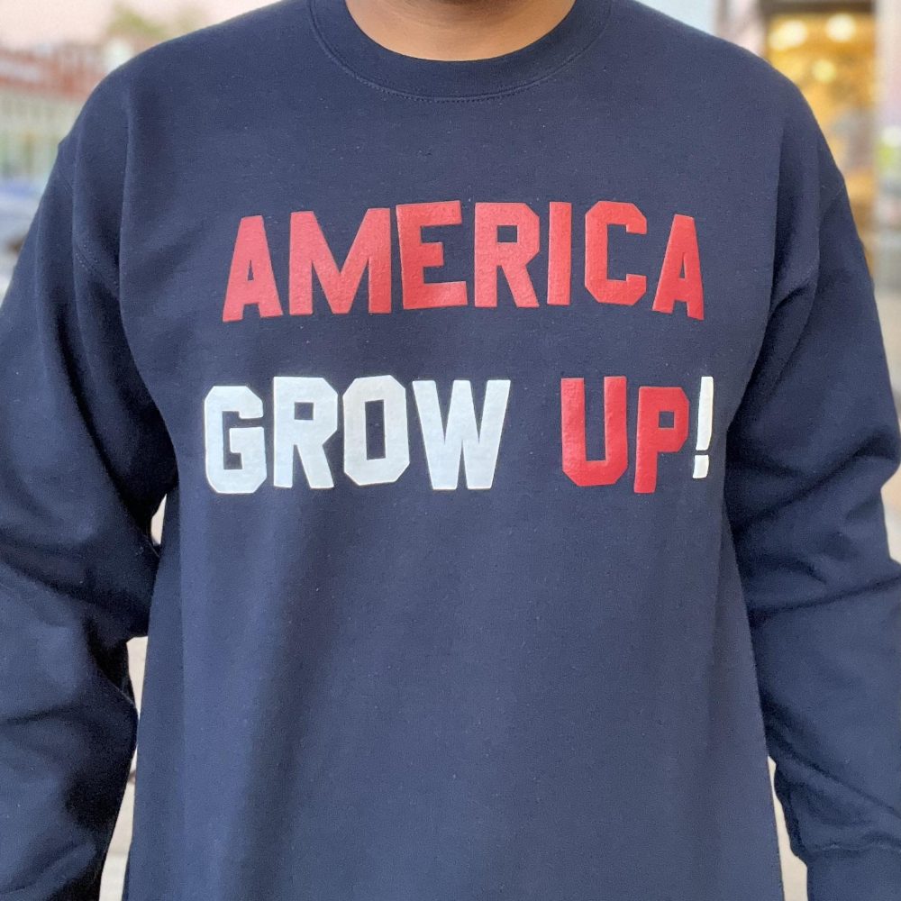 America Grow Up Sweatshirt by Skim Milk Clothing is made from super-soft 100% cotton. Features an 80’s style double-puff raised ink design on the front. This high-quality sweatshirt has a boxy 90’s style fit with dropped shoulders.