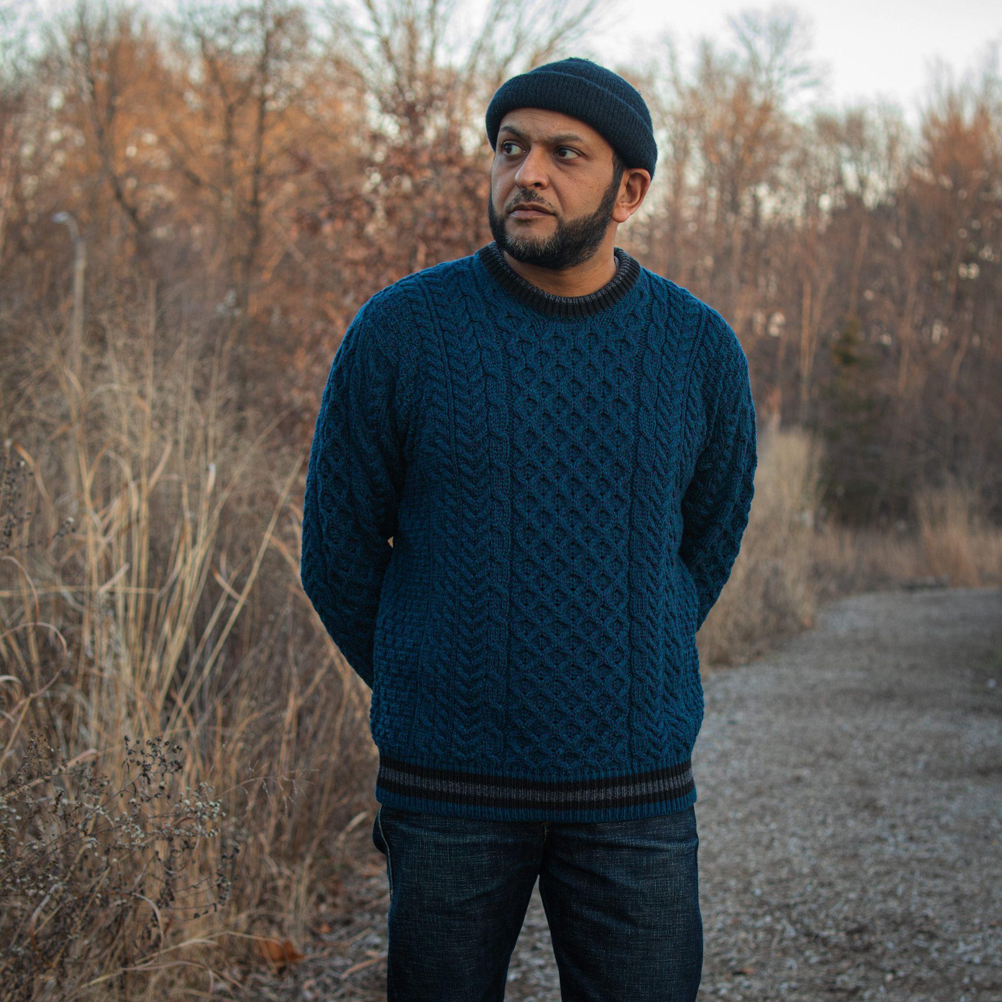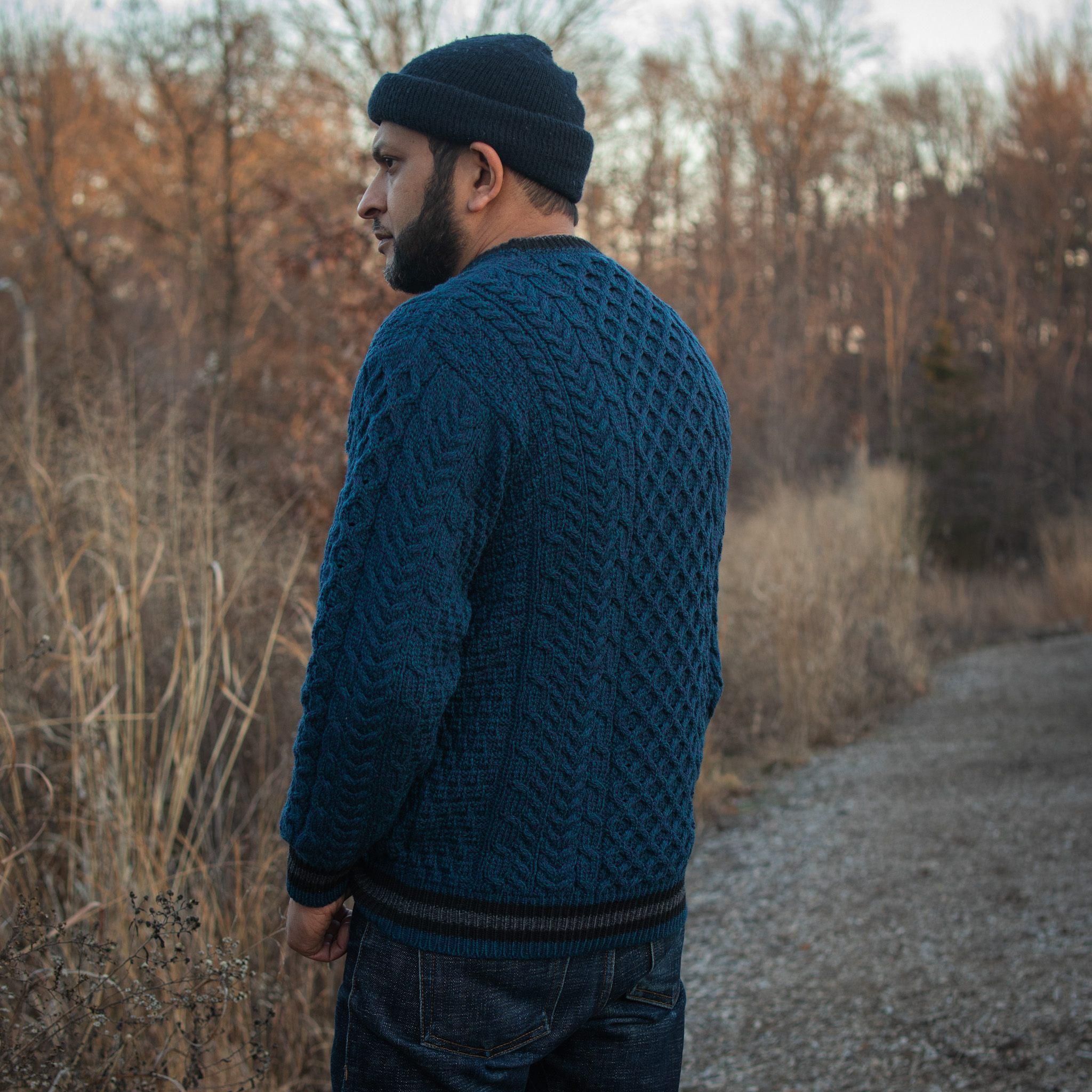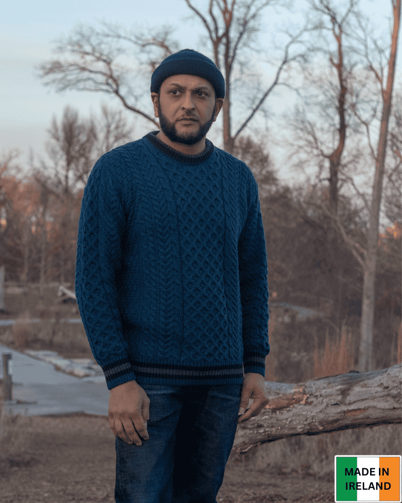 Whether paired with denim, chinos, or layered under a jacket, the Striped Aran Teal Sweater is a versatile wardrobe essential that combines heritage knitwear tradition with modern design.