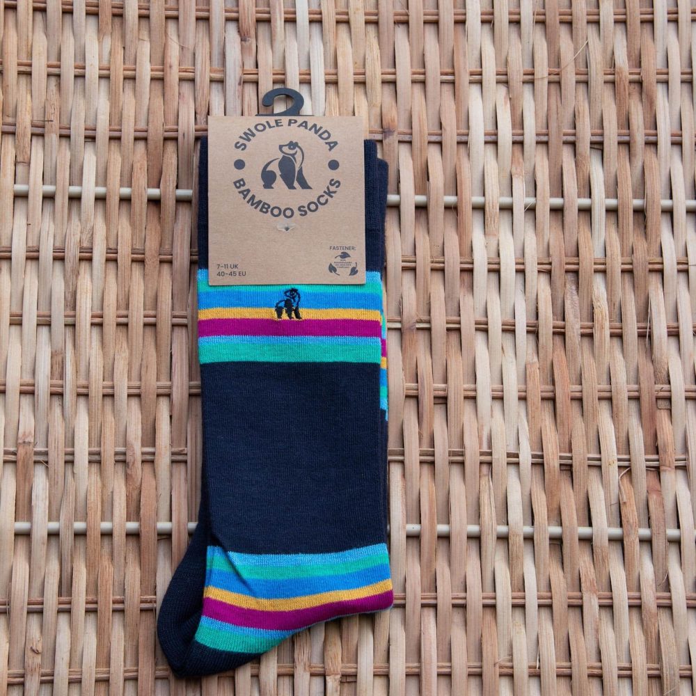 Swole Panda socks are made with 75% Moso Bamboo Viscose, 22% Polyamide on the heel and toe for durability and 3% Elastane for ultimate comfort, fit and feel. Machine wash at 80-105°F with like colors. Machine tumble drying not recommended. Fits men’s US shoe sizes 8-12.