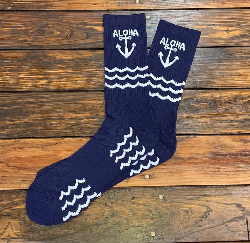 Aloha Socks by The Ampal Creative are woven with a sea-faring inspired motif. A Bamboo and Cotton blend with a cashmere feel. Repels odors and is much more breathable than regular cotton socks.